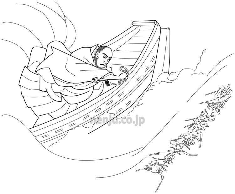 日蓮は船上に立つと、朝日を受ける水精の数珠を手に「南無妙法蓮華経」と高らかに唱えました。すると波間に「南無妙法蓮華経」の文字が出現し、波はたちまち鎮まりました。