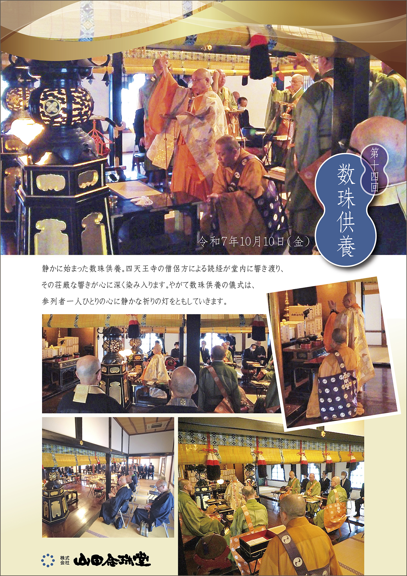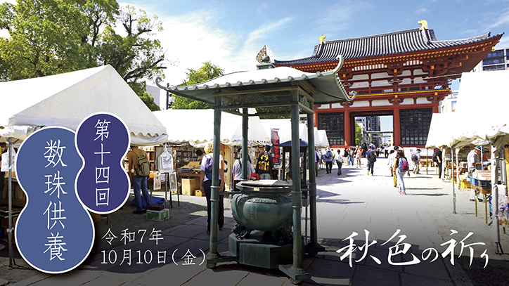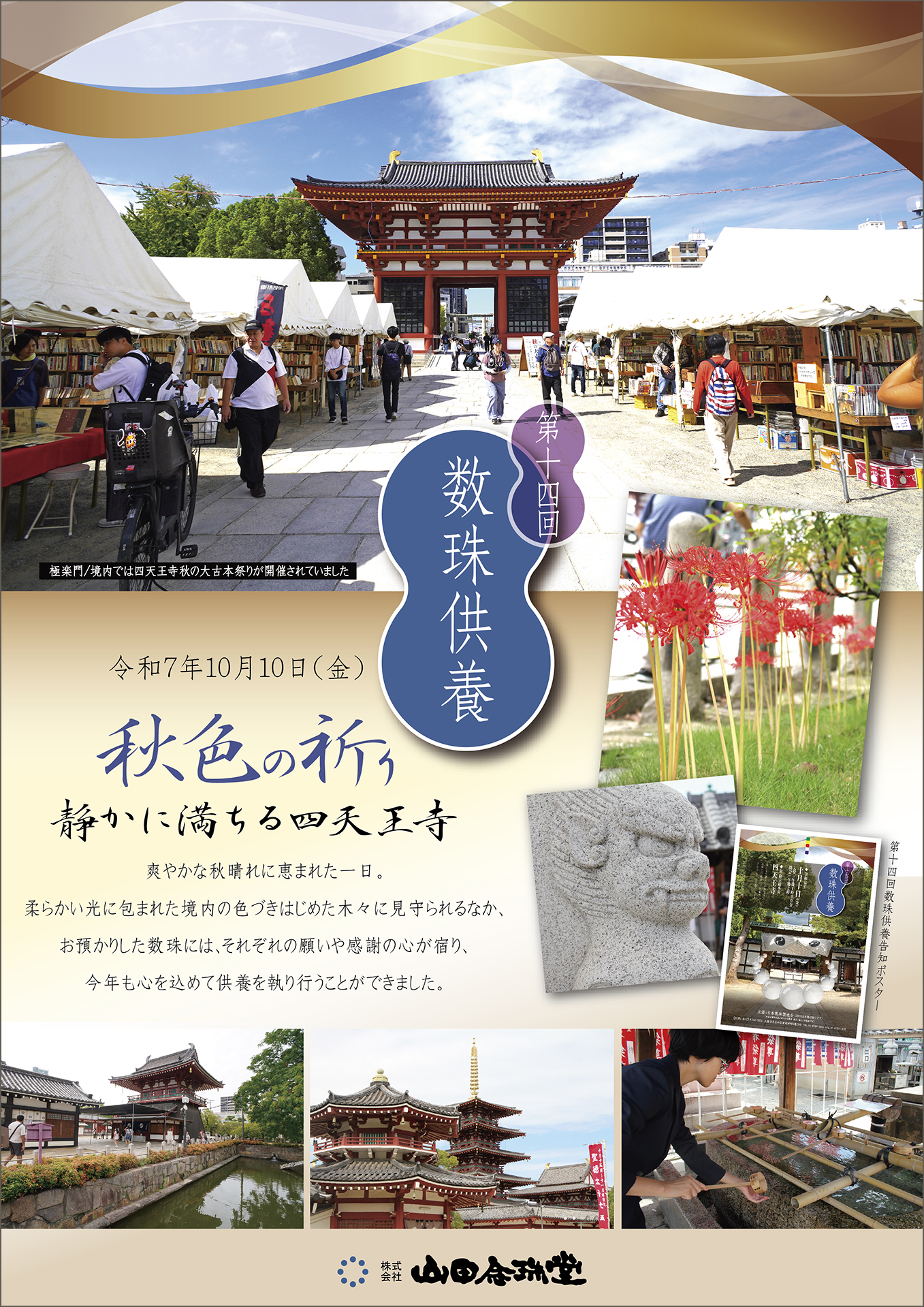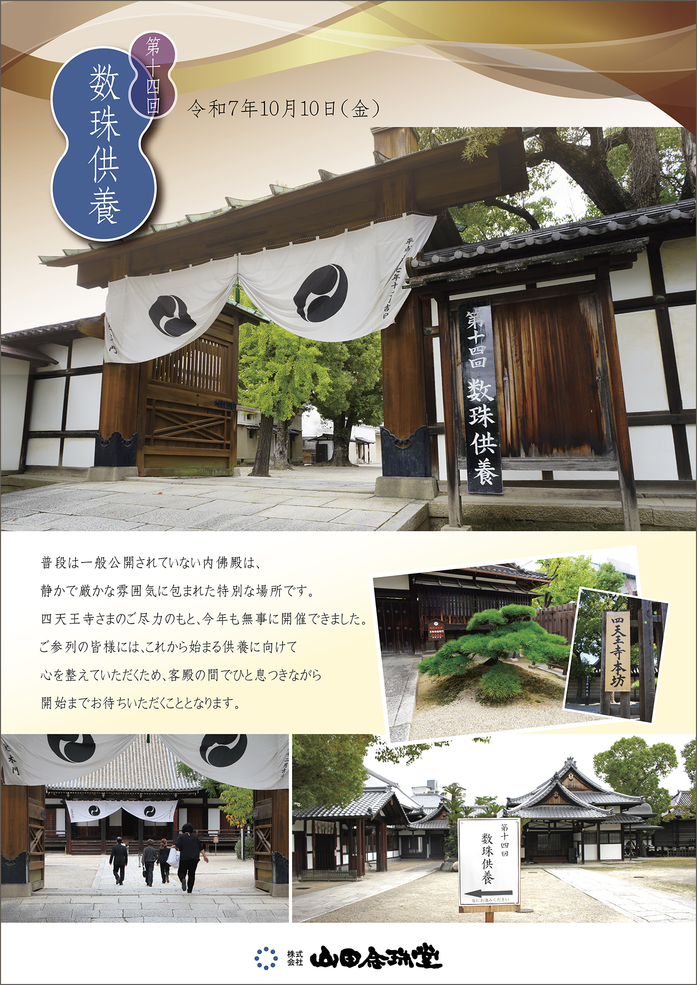 静かに満ちる四天王寺。爽やかな秋晴れに恵まれた一日。柔らかい光に包まれた境内の色づきはじめた木々に見守られるなか、お預かりした数珠には、それぞれの願いや感謝の心が宿り、今年も心を込めて数珠供養を執り行うことができました。