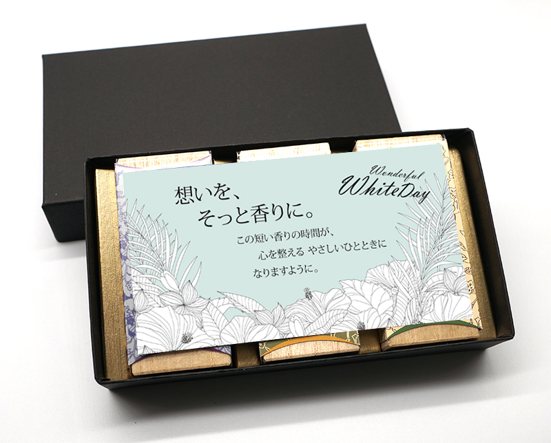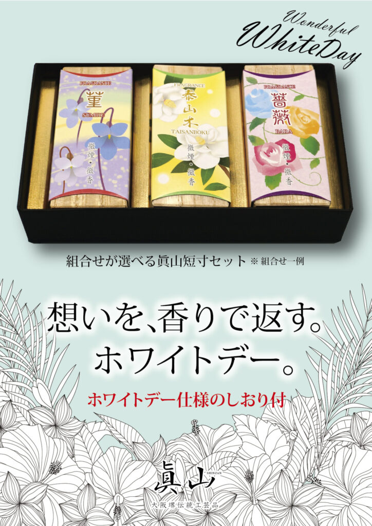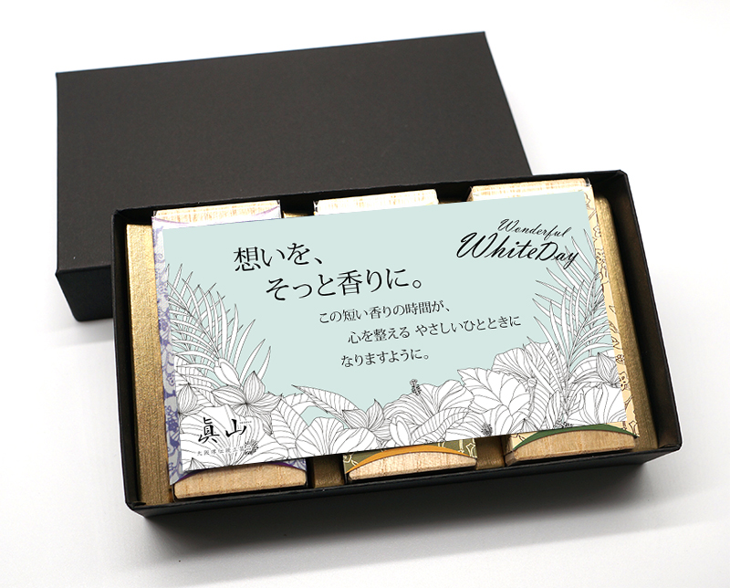 大阪・堺の伝統を受け継ぐ「眞山(しんざん)」の短寸線香。21種類の香りの中から、お好みの3種を選んで、バレンタインの返礼として想いを香りに託してみてはいかがでしょうか。
