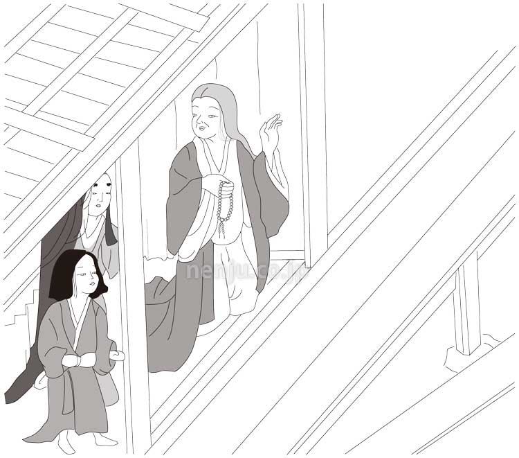 「私はもともと仏法にはまったく関心がございませんでしたが、一遍様が近くまで来られているとお聞きしました。すると夢の中に小仏が行道する中に背の高い一遍上人の姿が見えたと思いましたら目が覚め、陰陽師を呼んでこの夢が吉夢なの凶夢なのかを占わせたところ吉と出ました。そこで一遍上人と同行の方々を屋敷に入れたところ、鉦を叩き、念仏を称えながら踊る念仏踊りが始まったのです。私は踊りの外で念仏を称えながら小躍りしましたが、もうそれは興奮してしまって、はっと気付いたら数珠が切れてしまいました。踊りが終わった後、散った玉を集めている私に一遍上人が『四天王寺あたりの数珠屋の娘に直しを頼めばよい』とおっしゃてくださいました。この数珠の仕立て直しと、男物の数珠を200連、女性用の数珠を200連お願いします。」文と共に届けられた箱には数千貫文の宋銭がつけらていました。