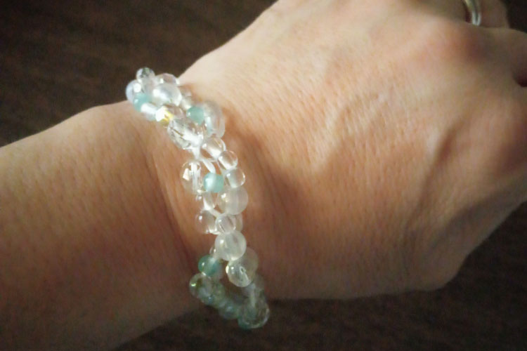 腕に付けた写真を撮ったので送らせていただきます。海辺に寄せる彩りのある波をイメージしたとのことでとても優雅で品もあり付けているとキラキラと綺麗で、見ているだけでも心落ち着いて癒されます。素敵な創作ブレス念珠を本当にありがとうございました。(香川・女性)