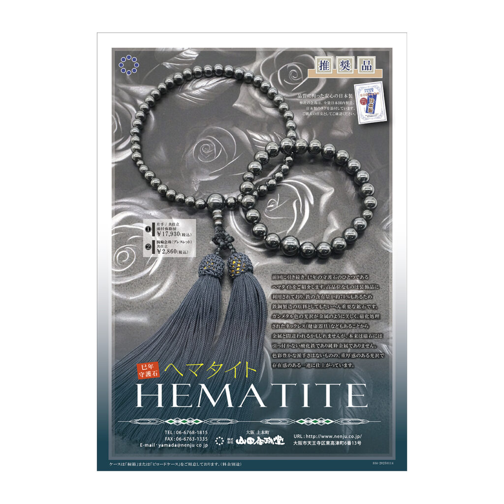 前回に引き続き、巳年の守護石のひとつであるヘマタイトをご紹介します。ヘマタイトは、高品位なものは装飾品に利用されており、鉄の含有量が約70%もあるため鉄鋼製造の原料としてもたいへん重要な鉱石です。ガンメタル色の光沢が金属のように美しく、磁化処理されたネックレス(健康器具)などもあることから金属と間違われるかもしれませんが、本来は磁石には引っ付かない酸化鉄であり純粋金属でありません。色彩豊かな派手さはないものの、重厚感のある光沢で存在感のある一連に仕上がっています。