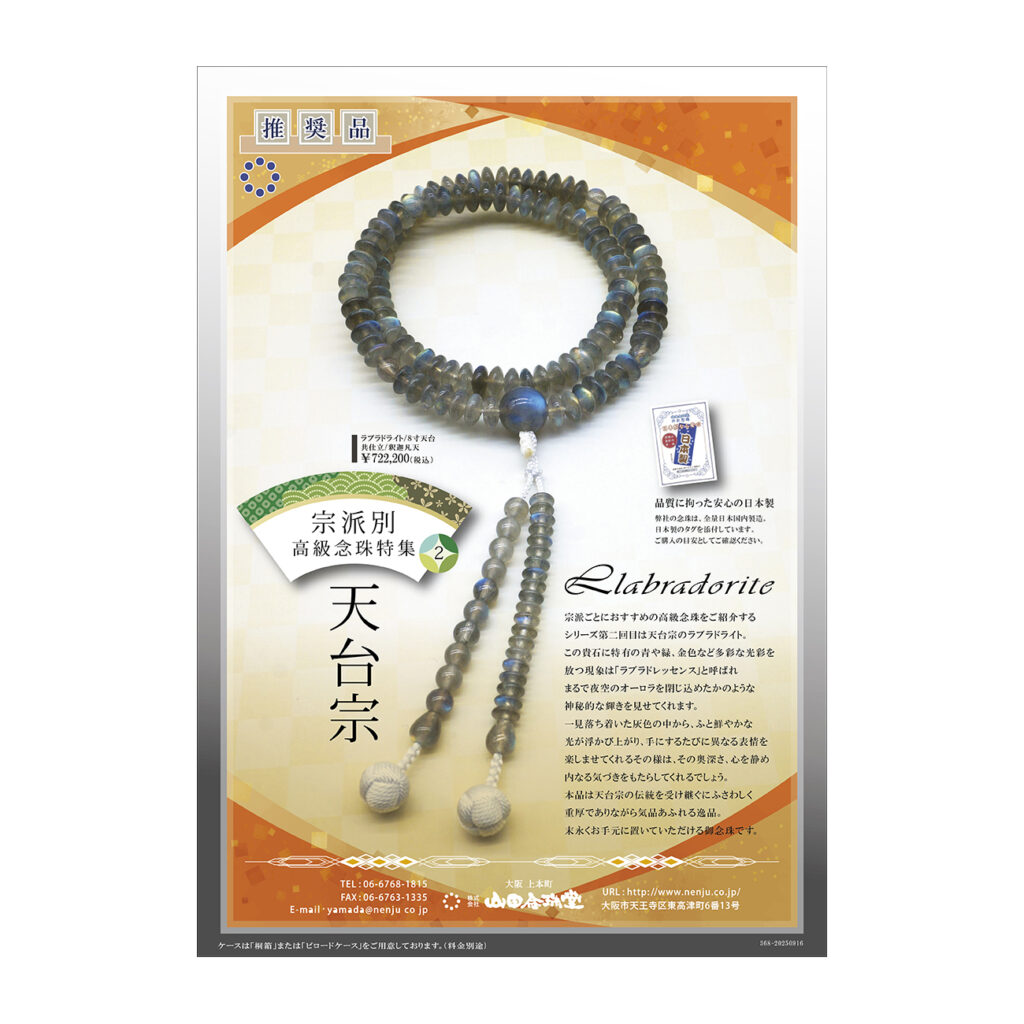 宗派ごとにおすすめの高級念珠をご紹介するシリーズ第二回目は天台宗のラブラドライト。この貴石に特有の青や緑、金色など多彩な光彩を放つ現象は「ラブラドレッセンス」と呼ばれ、まるで夜空のオーロラを閉じ込めたかのような神秘的な輝きを見せてくれます。一見落ち着いた灰色の中から、ふと鮮やかな光が浮かび上がり、手にするたびに異なる表情を楽しませてくれるその様は、その奥深さ、心を静め内なる気づきをもたらしてくれるでしょう。本品は天台宗の伝統を受け継ぐにふさわしく重厚でありながら気品あふれる逸品。末永くお手元に置いていただける御念珠です。