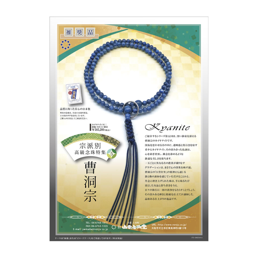 ご紹介するシリーズ第五回は、深い静寂を湛える曹洞宗のカイヤナイトです。深海を思わせる青の中に、透明感と奥行きを宿す希少石カイヤナイト。その澄みきった色調は、心を研ぎ澄まし、雑念を静めるような静謐な美しさを放ちます。一玉ごとに異なる青の濃淡が織りなすグラデーションは、まるで心の深奥を映す鏡。曹洞宗の「只管打坐」の精神にも通じる静と動の調和を感じていただけることかと。丹念に磨き上げられた珠は、手に取るたび凛とした気品と落ち着きを与え、日々の勤行に一層の清浄をもたらすことでしょう。その深みある輝きと精緻な仕立てが調和した、品格ある仕上がりの逸品です。