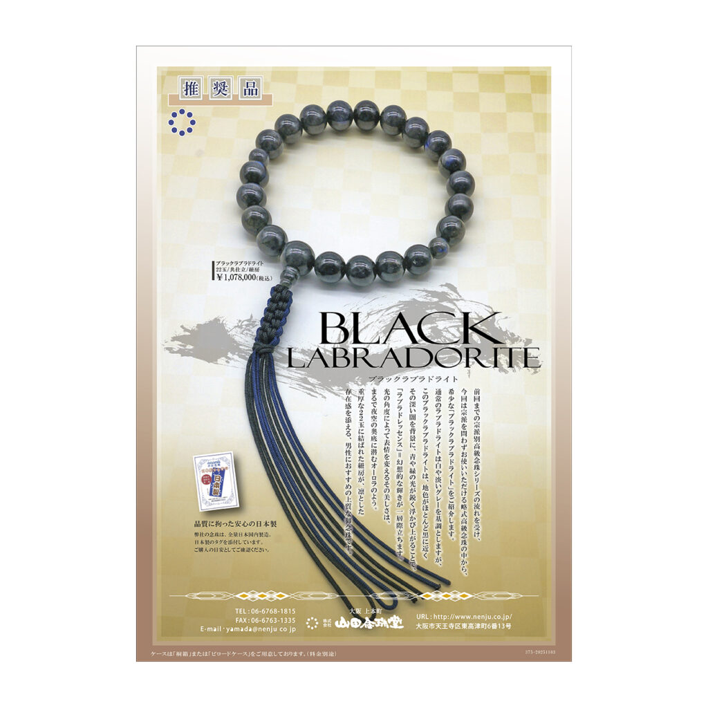 前回までの宗派別高級念珠シリーズの流れを受け、今回は宗派を問わずお使いいただける略式高級念珠の中から、希少な「ブラックラブラドライト」をご紹介します。通常のラブラドライトは白や淡いグレーを基調としますが、このブラックラブラドライトは、地色がほとんど黒に近くその深い闇を背景に、青や緑の光が鋭く浮かび上がることで、「ラブラドレッセンス」=幻想的な輝きが一層際立ちます。光の角度によって表情を変えるその美しさは、まるで夜空の奥底に潜むオーロラのよう。重厚な22玉に結ばれた紐房が、凛とした存在感を添える、男性におすすめの上質な御念珠です。