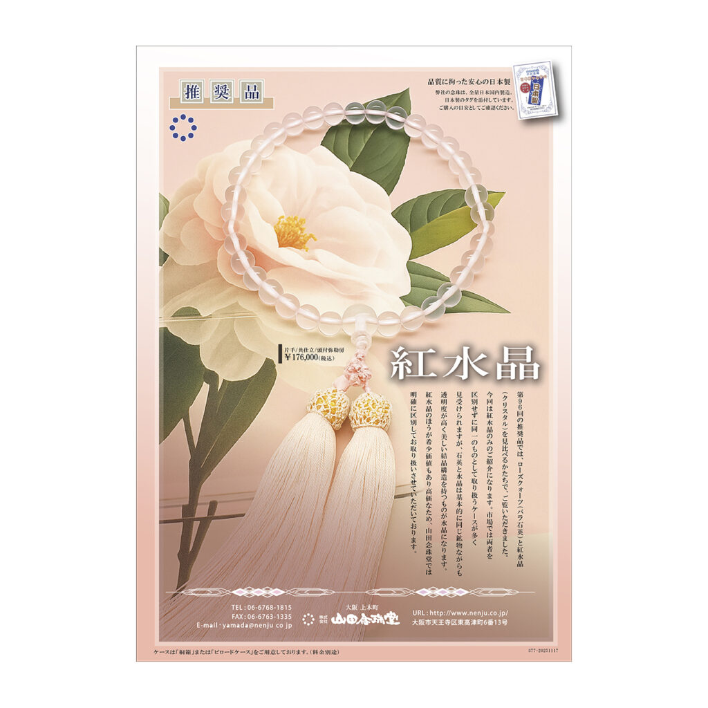第96回の推奨品では、ローズクォーツ(バラ石英)と紅水晶(クリスタル)を見比べるかたちで、ご覧いただきました。今回は紅水晶のみのご紹介になります。市場では両者を区別せずに同一のものとして取り扱うケースが多く見受けられますが、石英と水晶は基本的に同じ鉱物ながらも透明度が高く美しい結晶構造を持つものが水晶になります。紅水晶のほうが希少価値もあり高価なため、山田念珠堂では明確に区別してお取り扱いさせていただいております。