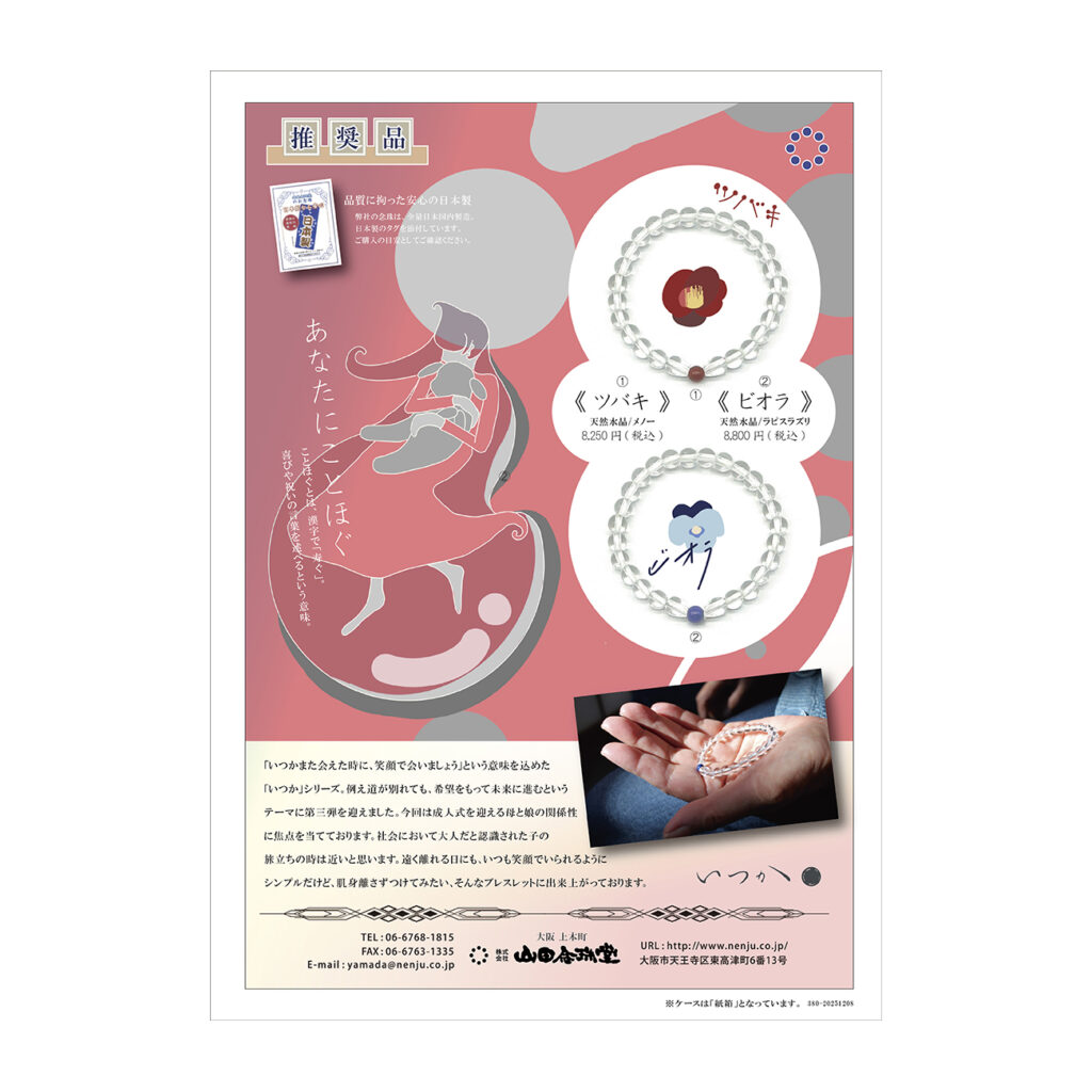「いつかまた会えた時に、笑顔で会いましょう」という意味を込めた「いつか」シリーズ。例え道が別れても、希望をもって未来に進むというテーマに第三弾を迎えました。今回は成人式を迎える母と娘の関係性に焦点を当てております。社会において大人だと認識された子の旅立ちの時は近いと思います。遠く離れる日にも、いつも笑顔でいられるようにシンプルだけど、肌身離さずつけてみたい、そんなブレスレットに出来上がっております。