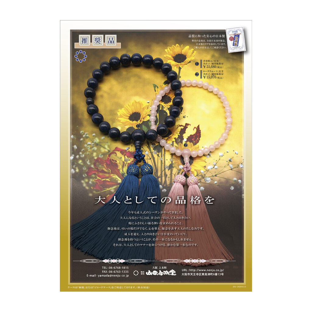 今年も成人式のシーズンがやってきました。大人になるということは、社会の一員として人と向き合い、場にふさわしい振る舞いを求められること。御念珠は、弔いの場だけでなく、心を整え、敬意を表す大人のたしなみです。成人を迎え、人との向き合い方が変わっていく今。御念珠を持つということが、その一歩になるかもしれません。それは、大人としてのマナーを身につける、静かな第一歩なのです。