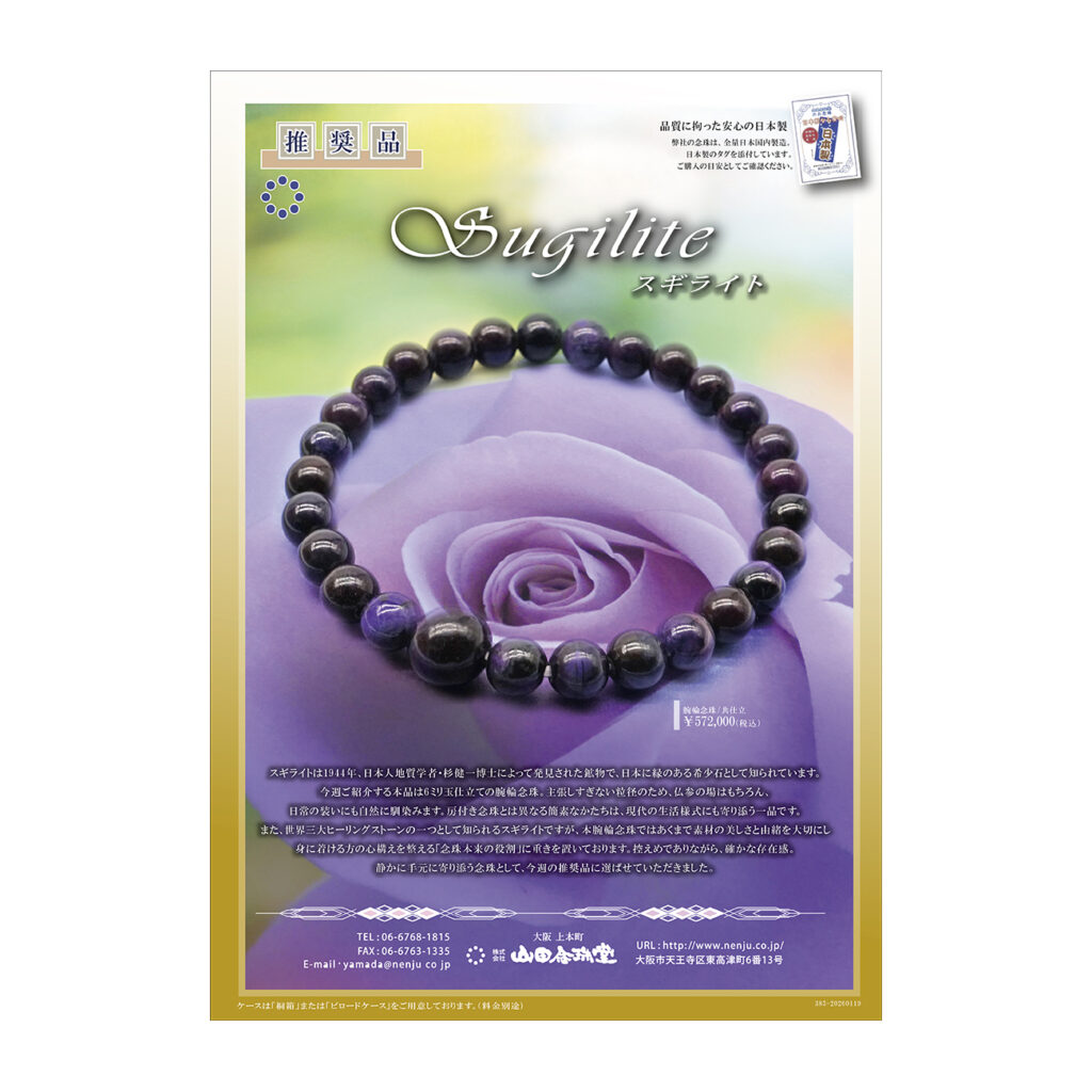 スギライトは1944年、日本人地質学者・杉健一博士によって発見された鉱物で、日本に縁のある希少石として知られています。今週ご紹介する本品は6ミリ玉仕立ての腕輪念珠。主張しすぎない粒径のため、仏参の場はもちろん、日常の装いにも自然に馴染みます。房付き念珠とは異なる簡素なかたちは、現代の生活様式にも寄り添う一品です。また、世界三大ヒーリングストーンの一つとして知られるスギライトですが、本腕輪念珠ではあくまで素材の美しさと由緒を大切にし身に着ける方の心構えを整える「念珠本来の役割」に重きを置いております。控えめでありながら、確かな存在感。静かに手元に寄り添う念珠として、今週の推奨品に選ばせていただきました。