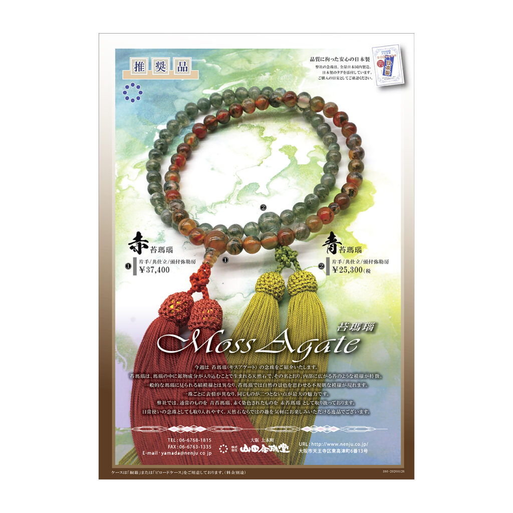 今週は 苔瑪瑙(モスアゲート) の念珠をご紹介いたします。苔瑪瑙は、瑪瑙の中に鉱物成分が入り込むことで生まれる天然石で、その名とおり、内部に広がる苔のような模様が特徴。一般的な瑪瑙に見られる縞模様とは異なり、苔瑪瑙では自然の景色を思わせる不規則な模様が現れます。一珠ごとに表情が異なり、同じものが二つとない点が最大の魅力です。弊社では、通常のものを 青苔瑪瑙、赤く染色されたものを 赤苔瑪瑙 として取り扱っております。日常使いの念珠としても取り入れやすく、天然石ならではの趣を気軽にお楽しみいただける逸品でございます。