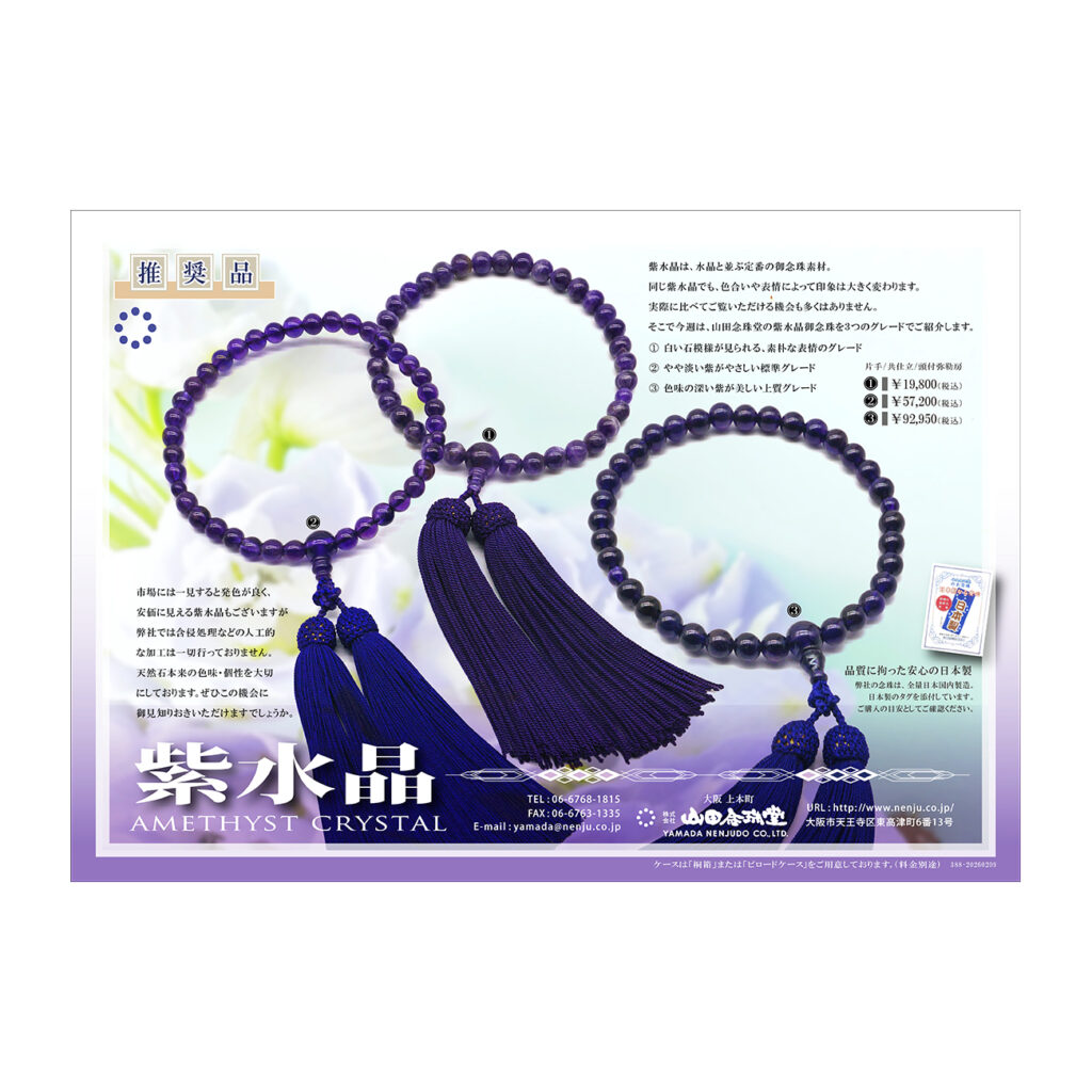 紫水晶は、水晶と並ぶ定番の御念珠素材。同じ紫水晶でも、色合いや表情によって印象は大きく変わります。実際に比べてご覧いただける機会も多くはありません。そこで今週は、山田念珠堂の紫水晶御念珠を3つのグレードでご紹介します。市場には一見すると発色が良く、安価に見える紫水晶もございますが弊社では含侵処理などの人工的な加工は一切行っておりません。天然石本来の色味・個性を大切にしております。ぜひ、この機会に御見知りおきいただけますでしょうか。
