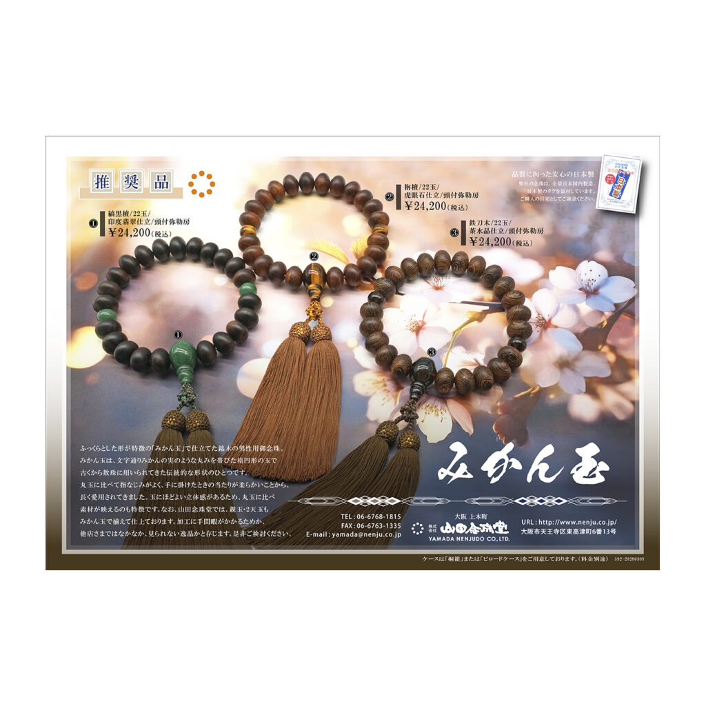 ふっくらとした形が特徴の「みかん玉」で仕立てた銘木の男性用御念珠。みかん玉は、文字通りみかんの実のような丸みを帯びた楕円形の玉で、古くから数珠に用いられてきた伝統的な形状のひとつです。丸玉に比べて指なじみがよく、手に掛けたときの当たりが柔らかいことから、長く愛用されてきました。玉にほどよい立体感があるため、丸玉に比べ素材が映えるのも特徴です。なお、山田念珠堂では、親玉・2天玉もみかん玉で揃えて仕上ております。加工に手間暇がかかるためか、他店さまではなかなか、見られない逸品かと存じます。是非ご検討ください。