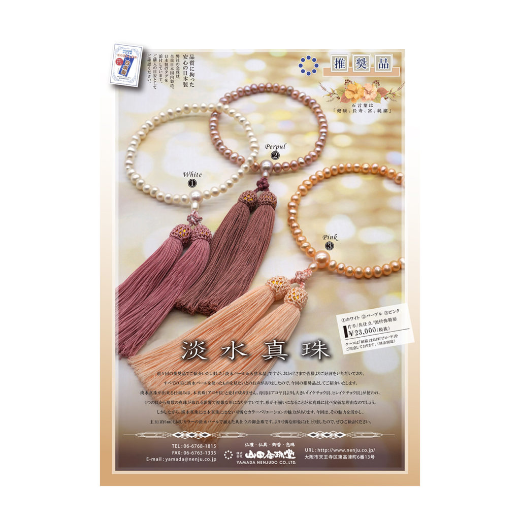 前々回の推奨品でご紹介いたしました「天然水晶&淡水真珠」ですが、おかげさまで皆様よりご好評をいただいており、すべての玉に淡水パールを使ったものを見たいとのお声がありましたので、今回の推奨品としてご紹介いたします。淡水真珠が出来る仕組みは、本真珠(アコヤ貝)と変わりありません。母貝はアコヤ貝よりも大きい「イケチョウ貝、ヒレイケチョウ貝」が使われ、1つの貝から複数の真珠が取れる影響で複雑な形になりやすいです。形が不揃いになることが本真珠に比べ安価な理由なのでしょう。しかしながら、淡水真珠には本真珠にはない可憐なカラーバリエーションの魅力があります。今回は、その魅力を活かし、主玉(約6㎜)も同じカラーの淡水パールで揃えた共仕立の御念珠です。より可憐な印象に仕上りました。