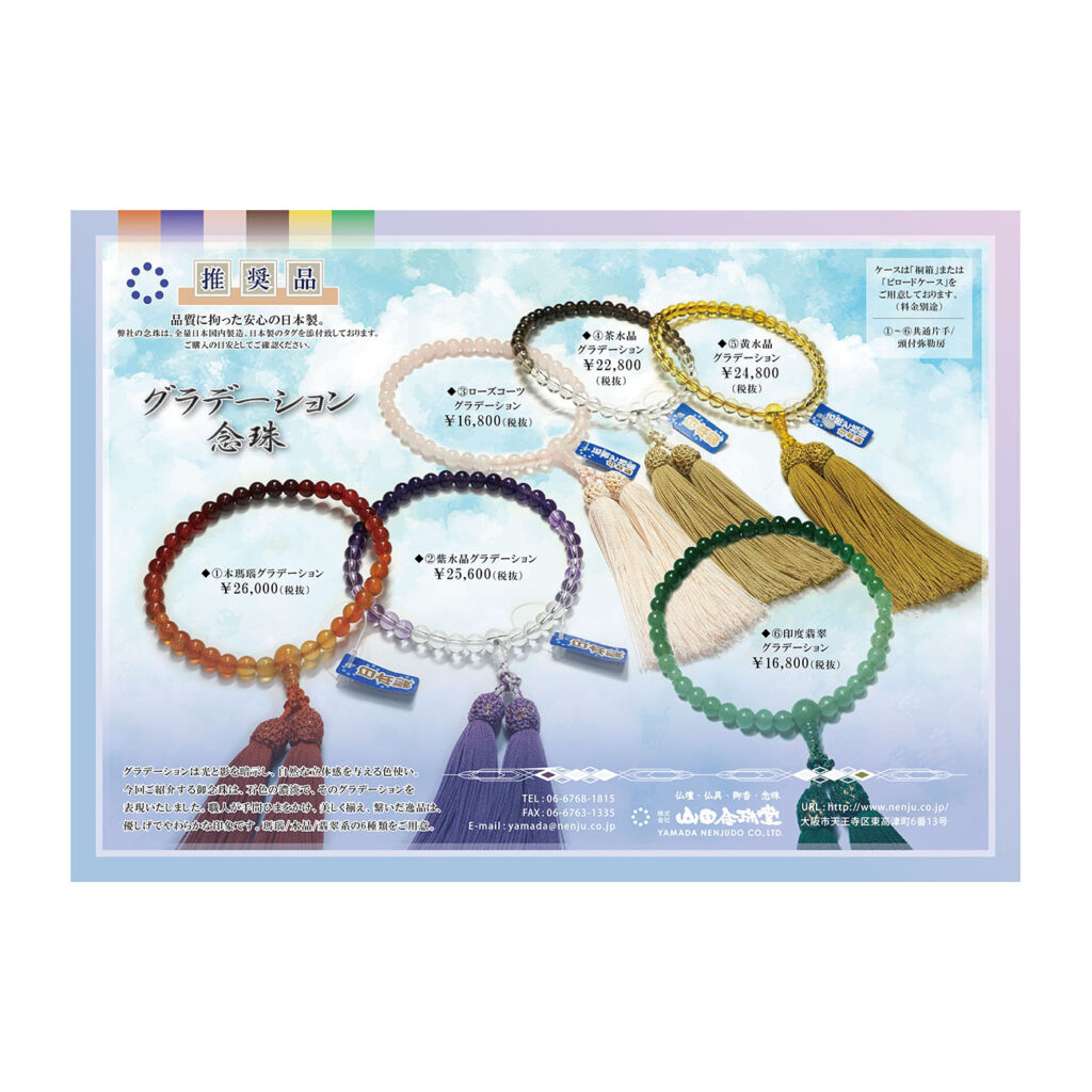 グラデーションは光と影を暗示し、自然な立体感を与える色使い。今回ご紹介する御念珠は、石色の濃淡で、そのグラデーションを表現いたしました。職人が手間ひまをかけ、美しく揃え、繋いだ逸品は、優しげでやわらかな印象でございます。瑪瑙・水晶・翡翠系の6種類をご用意いたしました。ご検討いただけましたら幸いです。