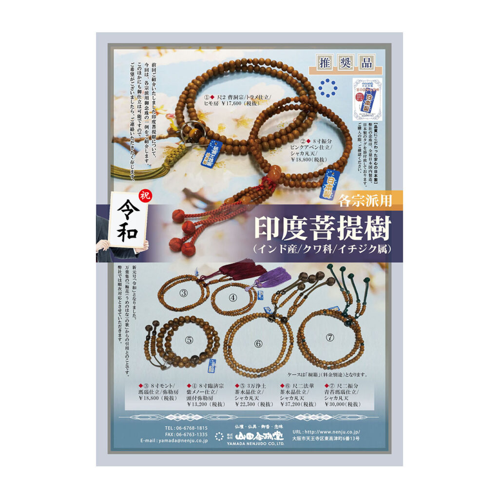 前回ご紹介いたしました印度菩提樹について、今回は、各宗派用御念珠の一例をご紹介します。このほかにも御仕立は可能ですのでご希望がございましたら、ご連絡いただきたく存じます。