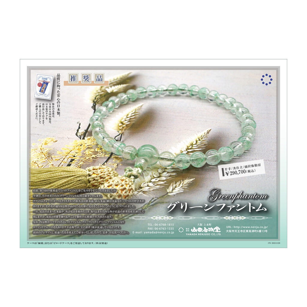 以前、第78回の推奨品で「レッドファントム」をご案内をさせていただきましたが今週は、その色変わりの「グリーンファントム」をご紹介いたします。ファントムクォーツ(ゴーストクリスタル)の和名は幻影水晶・山入水晶・幽幻水晶など、いくつかの呼び名がありますが、その名の通り内包物が山のような幻影に見えることから、このように名づけられました。一旦、成長の止まった水晶が、再び成長を始めたとき、取り込まれた内包物が結晶の形状を成長跡として残しますが、成長と停滞を繰り返すことで独特の石模様が生み出されます。なお、内包物がヘマタイトだとレッドファントム、クローライトだとグリーンファントムになりホワイトやブルーの色もありますが市場では、主に前者2種が流通しているようです。前回のプレナイトと、似通った色を敢えてご紹介いたしましたので、是非、お見比べください。