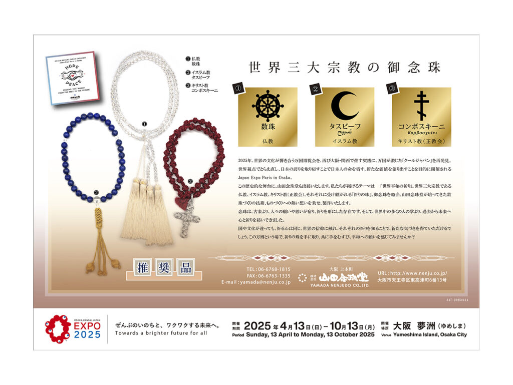 今週より2回に分けて 「3/27 山田念珠堂NEWS 」 で出展案内させていただきました 「2025大阪・関西万博 Japan Expo paris in Osaka」 にて出品する念珠をご案内をいたします。 「今週の推奨品」を通じて当日、会場にお越しになれない方にも、念珠の世界観を楽しんでいたけたら幸いです。第一回目の今週は概略をお伝えし、次週の第二回目は実際に展示する念珠をピックアップしてご案内の予定です。