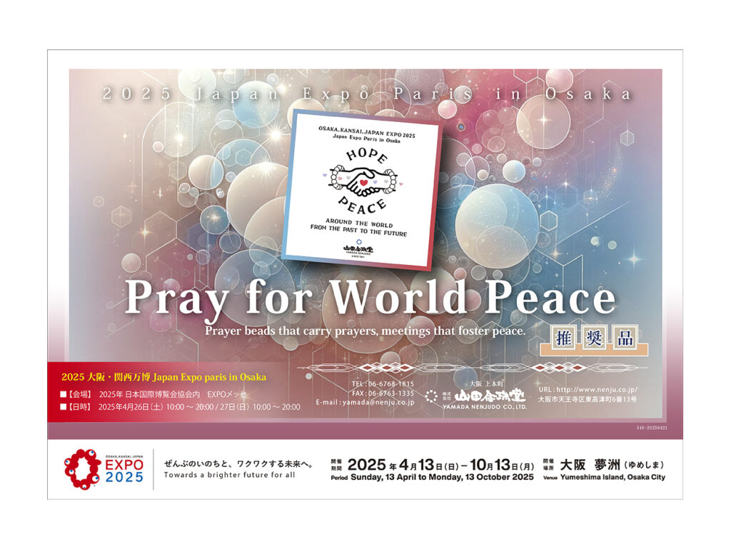 今週も先週に続き、「2025大阪・関西万博 Japan Expo Paris in Osaka」にて出品予定の念珠の一部を、参考としてご紹介させていただきます。老舗・山田念珠堂ならではの伝統技術を活かし、仏教の正式な数珠に加えて、イスラム教の「タスビーフ」やキリスト教(正教会)の「コンボスキーニ」といった他宗教の念珠も、各宗教の監修を受けながら丁寧に製作しております。すべての作品に「世界平和への祈り」を込め、一つひとつ心を込めて仕立てました。関係者の皆様からは、その完成度と芸術性に高い評価をいただいており、まもなく多くの方々に実物をご覧いただける貴重な機会を迎えます。会場でお会いできることを楽しみにしております。