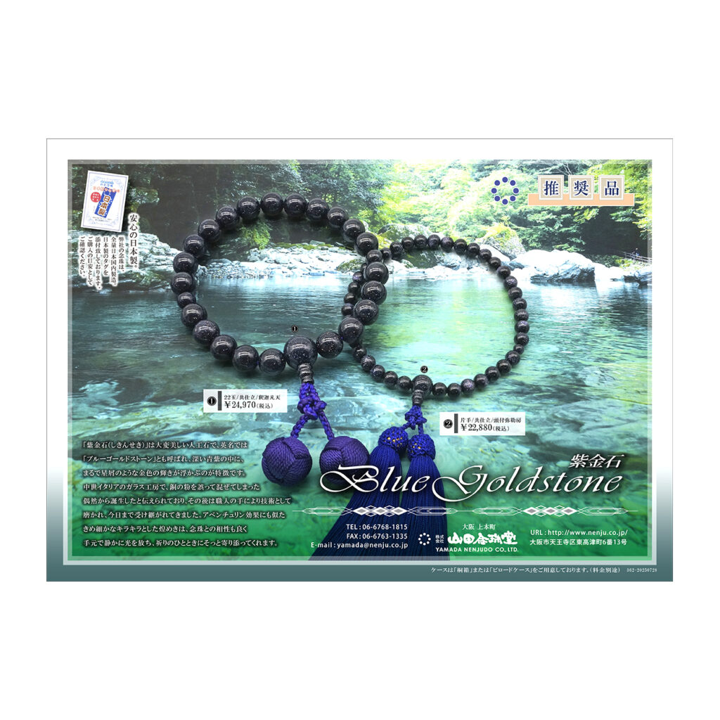 「紫金石(しきんせき)」は大変美しい人工石で、英名では「ブルーゴールドストーン」とも呼ばれ、深い青紫の中に、まるで星屑のような金色の輝きが浮かぶのが特徴です。中世イタリアのガラス工房で、銅の粉を誤って混ぜてしまった偶然から誕生したと伝えられており、その後は職人の手により技術として磨かれ、今日まで受け継がれてきました。アベンチュリン効果にも似たきめ細かなキラキラとした煌めきは、念珠との相性も良く手元で静かに光を放ち、祈りのひとときにそっと寄り添ってくれます。