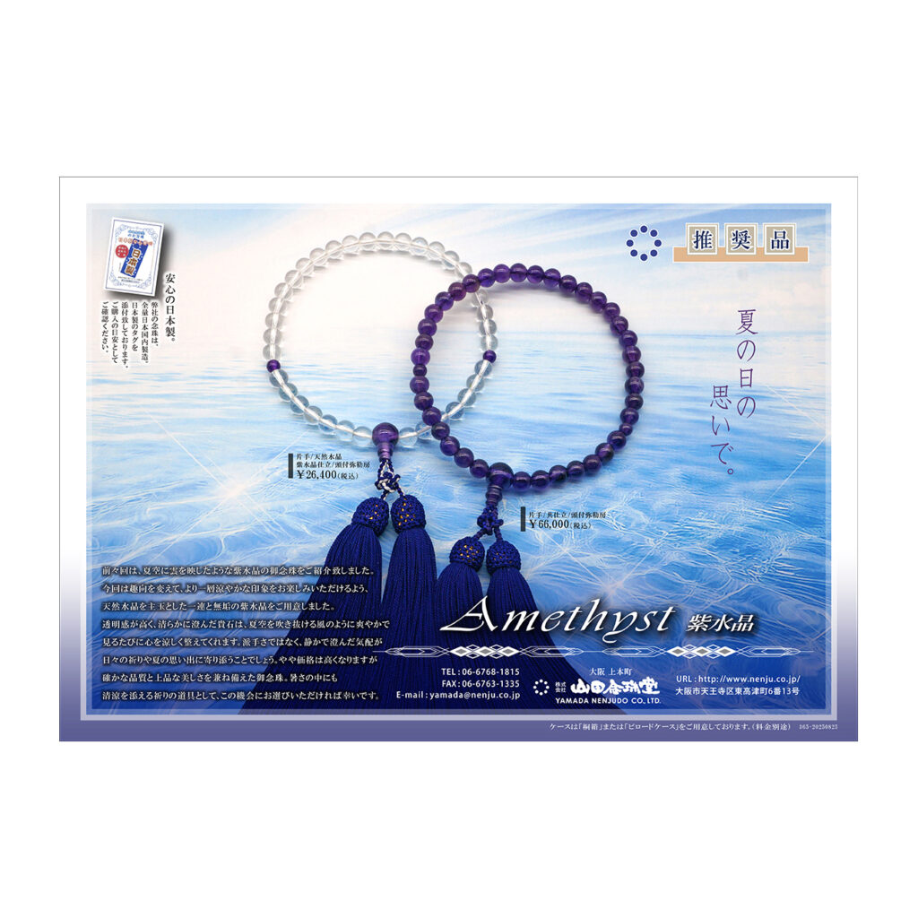 前々回は、夏空に雲を映したような紫水晶の御念珠をご紹介致しました。今回は趣向を変えて、より一層涼やかな印象をお楽しみいただけるよう、天然水晶を主玉とした一連と無垢の紫水晶をご用意しました。透明感が高く、清らかに澄んだ貴石は、夏空を吹き抜ける風のように爽やかで見るたびに心を涼しく整えてくれます。派手さではなく、静かで澄んだ気配が日々の祈りや夏の思い出に寄り添うことでしょう。前々回と比べ、やや価格は高くなりますが確かな品質と上品な美しさを兼ね備えた御念珠。暑さの中にも清涼を添える祈りの道具として、この機会にお選びいただければ幸いです。